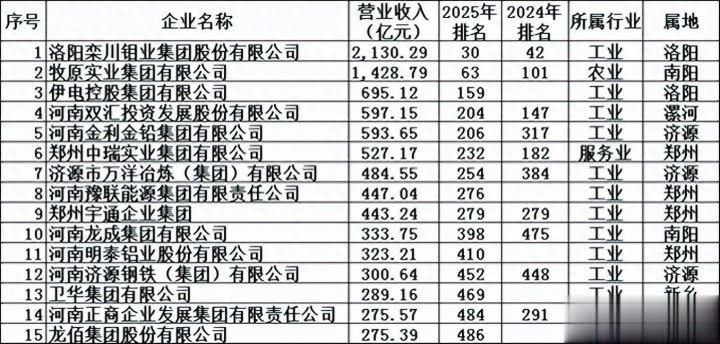 综上,2025年河南省共15家民企入围全国500强,较上年减少1家;其中栾川钼业领跑全省,工业占八成,新增5家、退出4家。